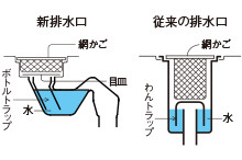 汚れがたまりやすかった従来排水口の「わんトラップ」