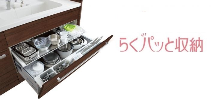 扉が斜めに傾くので力いらず。ラクにパッと取り出すことができる「らくパッと収納」が標準仕様です。